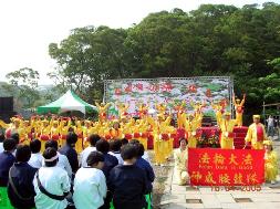 | 【明慧网2005年4月22日】2005年4月16日,台湾苗栗县于造桥乡“花语谷”花卉农场举行一年一度的桐花季开幕仪式。苗栗法轮功学员应主办单位的特别邀请为开幕仪式表演腰鼓,在热闹的气氛中向人们展示了法轮功修炼者乐观向上的风貌。 苗栗法轮功学员所组成的“神威腰鼓队”自今年二月份成军以来,受邀参与了本县元宵节等大型庆祝活动。元宵节当天虽然大雨滂沱、温度趋降、寒风刺骨,在其它游行队伍都一一解散的情况下,唯独法轮功学员不畏艰辛,有始有终的表演完,体现出不屈不挠的精神。目睹实况的民众很快的将那一幕坚毅的表现的传遍开来。如今人们都说法轮功学员不仅教人炼功打坐、将真善忍精神洪扬于世人,还是才艺双全的一群好人。 民众看过了腰鼓队的表演后,觉得法轮功跟他们以前见过的一般宗教完全不一样,便好奇的前来索取简介及主动了解中国大陆发生的迫害真象,并进一步到炼功点询问如何学炼法轮功。法轮大法真善忍已广传世界六十多个国家、地区,使上亿人身心受益,完全不涉政治。但是中共江氏集团却动用巨额的财力、物力、人力及谎言和栽赃等方式进行打压,误导世人。苗栗法轮功学员透过腰鼓队精神抖擞的表演方式让更多乡亲不再受谎言蒙蔽,明白真象的人们都愿意站在正义的一边相信“法轮大法好”。 注:桐花是台湾客家人早年重要经济作物之一,果实可以榨油、制作火柴棒、木屐,苗栗境内分布很多。而桐花祭的由来,是因为每年5月左右,在台三线沿山谷间如内湾、铜锣、三义、南庄、公馆等客家乡镇,白色的桐花满山遍野绽放,风吹起来后,一阵雪白桐花飘落有如下雪一般,大家称为“五月雪”,在异乡的客家人只要一看到“五月雪”飘落,就同时心领神会那股客家独有的诗意,所以,客委会才以桐花祭为主题,举办一系列的相关艺文活动。