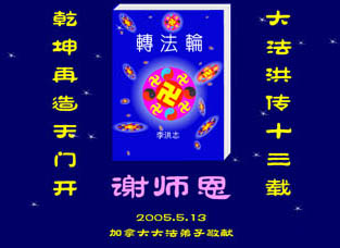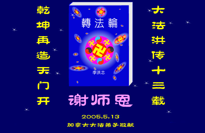 | 【明慧网2005年5月13日】 加拿大弟子恭贺师尊五十四岁华诞、热烈庆祝师尊传法十三周年暨世界法轮大法日! 美国德州全体大法弟子恭祝伟大慈悲的师尊生日快乐暨祝贺世界法轮大法日 西班牙全体大法弟子恭祝师父生日快乐,深深感谢师父慈悲救渡 纽约布碌仑大法弟子恭祝至尊至敬的师尊生日快乐 俄罗斯大法弟子恭祝慈悲伟大的师父54岁华诞 法国全体大法弟子恭祝师尊华诞! 美国德州达拉斯大法弟子恭祝师父生日快乐! 美国北加州大法弟子恭祝师尊生日快乐! 美国西北部地区大法弟子恭祝师尊生日快乐! 在新西兰的广州大法弟子祝师父生日快乐! 日本九州大法弟子恭贺师尊生日快乐暨世界法轮大法日! 南美洲秘鲁全体法轮大法弟子恭祝法轮大法洪传十三周年 德国全体马格德堡大法弟子值此普天同庆的日子恭祝师尊生日快乐,同时感恩师父的慈悲救度! 全体塞班岛大法弟子恭祝师尊生日快乐! 美国堪萨斯州以及大堪城地区全体大法弟子恭贺世界法轮大法日暨师尊传法十三周年!恭祝师尊生日快乐! 加拿大卡尔加里全体大法弟子向伟大慈悲的师尊问好! 台湾全体大法弟子恭贺慈悲伟大的师尊人间华诞暨世界法轮大法日 台湾台中大法弟子恭祝师尊生日快乐暨庆祝世界法轮大法! 多伦多大法弟子敬祝伟大师尊生日快乐! 美国密苏里州大法弟子恭贺师尊华诞、热烈庆祝师尊传法十三周年暨世界法轮大法日! 加拿大弟子恭贺师尊五十四岁华诞、热烈庆祝师尊传法十三周年暨世界法轮大法日!