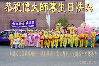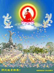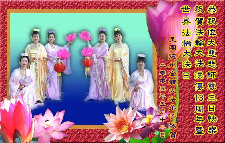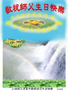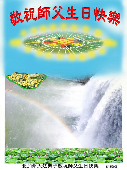 洪传大法正寰宇, 力解巨难定乾坤; 大穹众生沐佛恩, 随师回归绽清莲。 弟子们感谢师尊救度之恩!将谨遵师尊教诲,不负“正法时期大法弟子”这一神圣的称号!走好我们证实大法的修炼之路。 恭祝慈悲伟大的师尊生日快乐! 美国德州达拉斯全体大法弟子敬拜 二零零五年五月十日 美国北加州大法弟子恭祝师尊生日快乐!