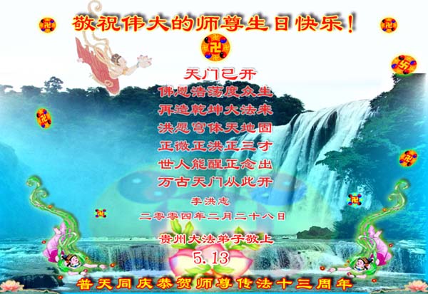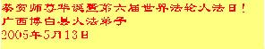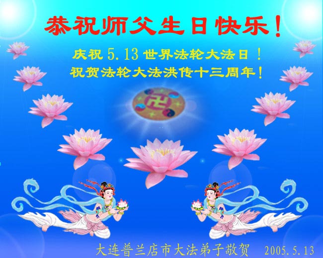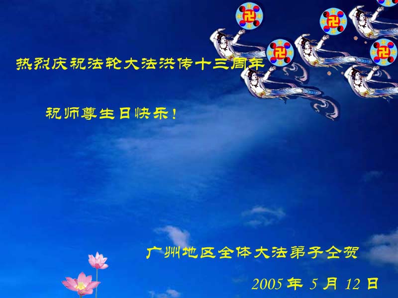 在喜庆2005年5月13日世界法轮大法日到来之际,广州深圳全体大法弟子恭贺慈悲伟大的师尊传法十三周年!向师尊致以最崇高的敬意,感谢师尊的慈悲苦度! 向师父问好! 向全世界大法弟子问好! 合十 广州深圳全体大法弟子 2005年5月10日 广州全体大法弟子恭祝师尊生日快乐!