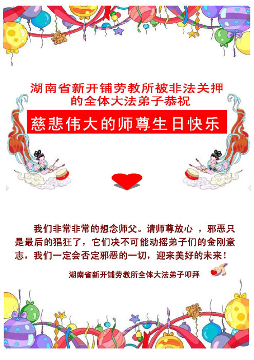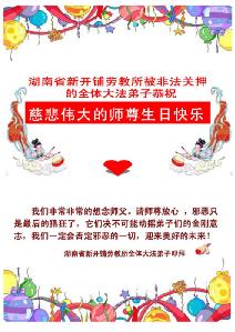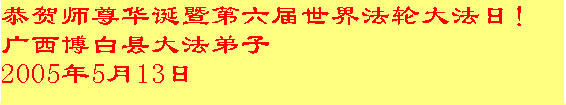 慈悲的师尊: 您辛苦了!恭祝师尊生日快乐,普天同庆,祝贺师尊传法13周年!我们一定谨记师尊的教诲,认真修好自己,用纯洁的心态,讲清真象,助师正法,唤醒被谎言蒙蔽的同胞。请师尊放心,无论身处何地,无论外界如何,我们一定要牢记自己的使命和责任,决不辜负师尊的慈悲救度。  新疆大法弟子 2005年5月13日 全体济南大法弟子及被非法关押在山东省监狱、女子监狱、王村劳教所、浆水泉劳教所、刘长山劳教所、洗脑班的所有大法弟子敬贺慈悲伟大的师尊五十四岁华诞!普天同庆第六届世界法轮大法日!
