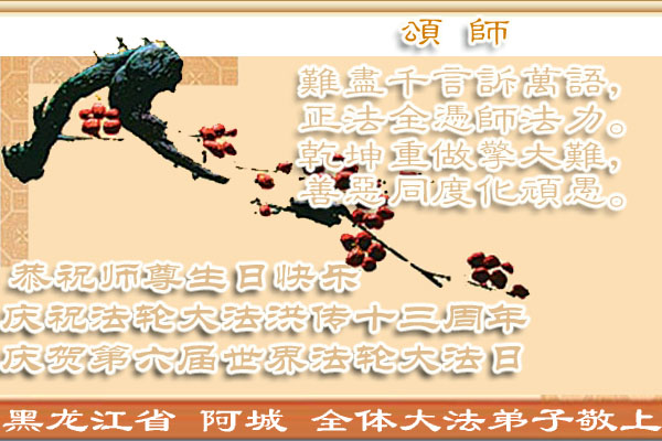 黑龙江阿城全体大法弟子祝师父生日快乐、贺大法洪传13周年!