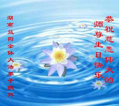在师尊生日暨师尊传法13周年纪念日到来之际,大法弟子及苍穹众生用尽人间最美好的千言万语诉说不尽我们对师父的感恩,用尽人间最美好的万语千言难以表达我们对师尊的敬仰。 普天同庆师尊传法13周年!恭祝至高无上的慈悲伟大的师尊生日快乐! 师父您辛苦了,师父,弟子们十分想念您!弟子们向师尊致以最崇高的敬意和深深的问候。 师尊请您放心,弟子们决不辜负师尊的慈悲救度,我们一定全身心的做好大法弟子应该做好的三件事,走正走好师父安排的路。更加清醒、更加理智的走好最后、最宝贵的正法之路!无愧于正法时期大法弟子这伟大的称号和殊荣。迎接法正人间和师尊团聚,普天同庆的美好明天! 沈阳市一学法小组全体大法弟子敬上 合十 2005年5月13日 湖南益阳全体大法弟子恭贺慈悲伟大的师尊生日快乐!