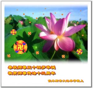 在普天同庆5.13世界法轮大法日暨师尊传法十三周年的时刻,我们四川全体大法弟子向慈悲伟大的师尊致以最崇高的敬意,恭祝师尊生日好!师尊您好!您辛苦了!弟子们十分想念您! 请师父放心,弟子们决不辜负师父的慈悲苦度,一定会按照师父的要求做好正法时期大法弟子应该做好的一切,紧跟正法進程,充分发挥每个大法粒子的作用,慈悲救度世人,完成史前大愿,跟随师尊回家。 在此,四川成都、自贡、泸州、乐山等地区的大法弟子向师父祝寿问好! 山东冠县大法弟子敬祝师尊五十四华诞暨师尊传法十三周年