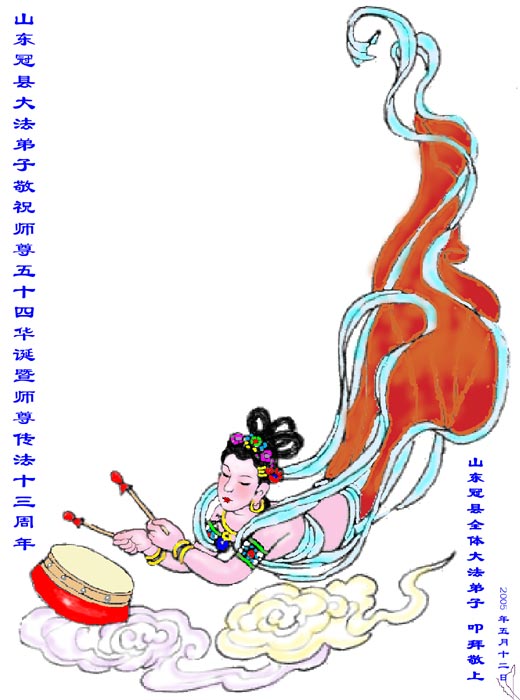 祝福 佛恩浩荡, 众生醒悟, 普天同庆, 人神共祝。 在这神圣的日子, 广州大法弟子祝师父节日快乐! 愿师父早日回国。 2005.05.13 山西省运城全体大法弟子恭贺师尊54华诞