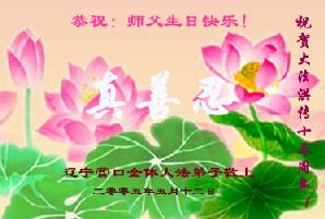 辽宁大石桥大法弟子向师父问好,祝师父生日快乐!祝贺大法洪传十三周年!