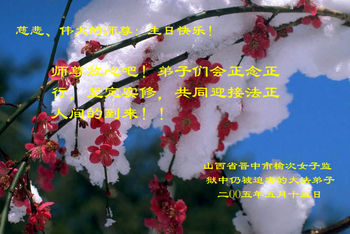 长空啊,春风正舞, 远处啊,云水正呼。 寄语我们希望的明慧网啊! 在伟大师尊的生日之际, 请捎去我们对远隔重洋伟大师尊的问候! 师尊啊,您好! 弟子们想您啊!您辛苦了! 您的弟子虽然身陷囹圄, 在高墙铁网内, 但是我们的心系众生, 魂系修炼, 一定把甘露洒向人间, 把被邪恶毒害的众生救度回来, 助师正法 随同主佛一起圆满回家 黑龙江女子监狱非法关押的全体大法弟子 2005年5月12日 牡丹江市大法弟子向伟大慈悲的师父问候生日
