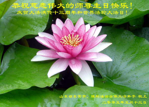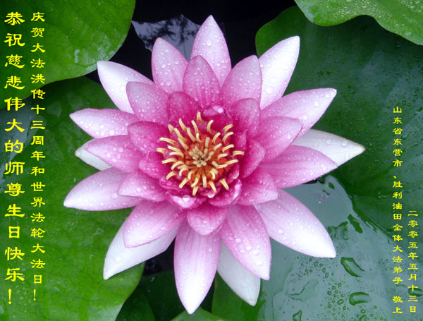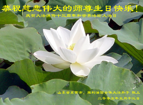 用尽人类的语言也无法表达弟子对慈悲伟大的师尊的无限崇高的敬仰,万语千言凝成一句:师父辛苦了!恭祝师尊生日快乐! 山东省东营市、胜利油田全体大法弟子敬上 二零零五年五月十三日 大陆大法弟子恭祝师尊生日快乐!