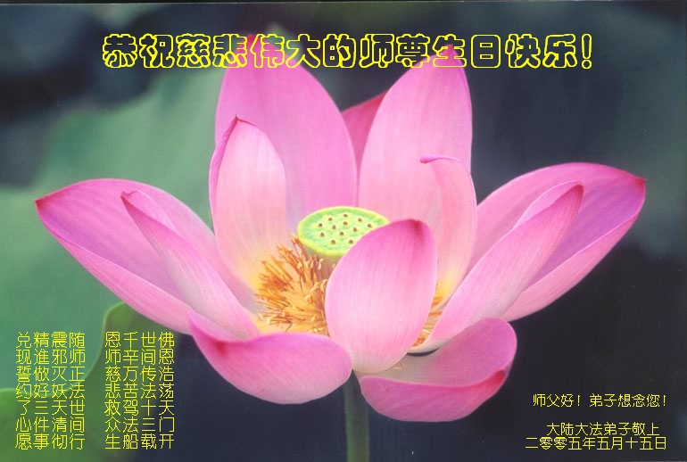 弟子们想念您! 2005年5月14日 天津大法弟子恭祝慈悲、伟大的师父生日快乐!