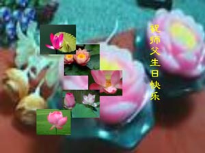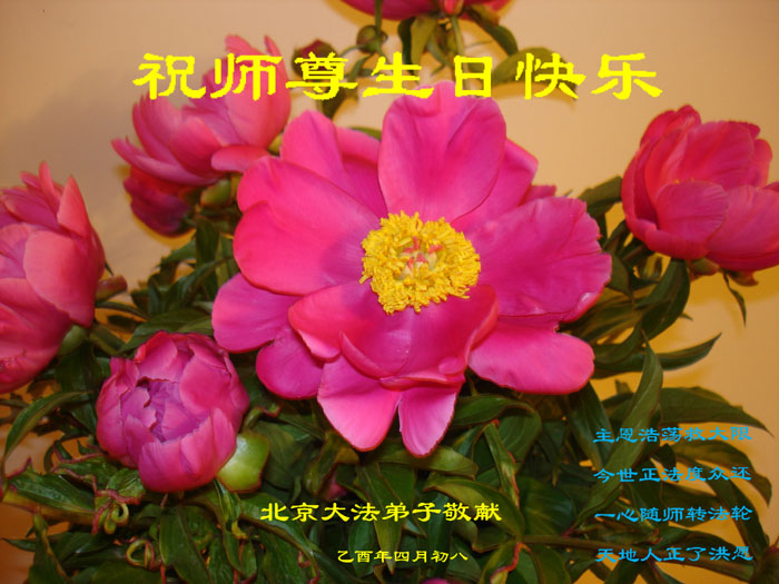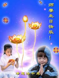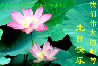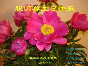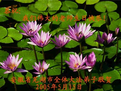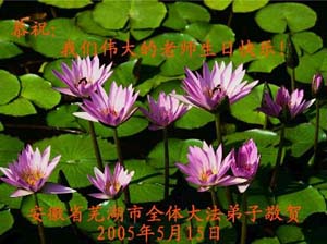 今天是师父的生日,我代表在狱中受难的大法弟子,本地区大法弟子,大陆大法弟子,向慈悲伟大的师父致以崇高的问候:“师父生日快乐!”同时我们会正念更强,做好三件事,救度世人。 甘肃酒泉大法弟子 2005.5.15。 重庆璧山大法弟子和北京一流离失所的大法弟子祝师父生日快乐!
