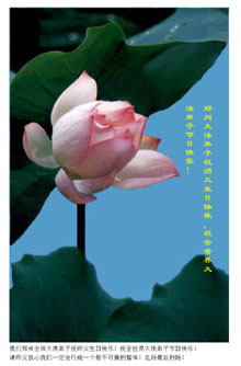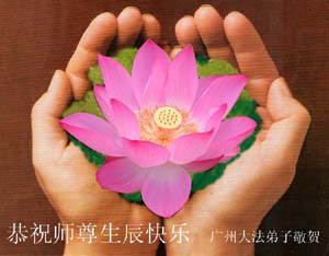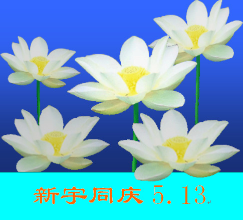 在师尊五十四岁华诞暨法轮大法洪传十三周年之际,我代表全体山西大法弟子恭祝慈悲伟大的师父生日快乐! 我们将在今后的正法修炼道路上坚定圆满的走好自己的每一步,同时努力做好师父嘱咐的三件事,正念正行勇猛精進,决不辜负大法弟子肩负的伟大历史使命!师父我们想念您! 山西晋中大法弟子 2005.5.14 广东河源市全体大法弟子恭贺师尊华诞暨世界法轮大法日!