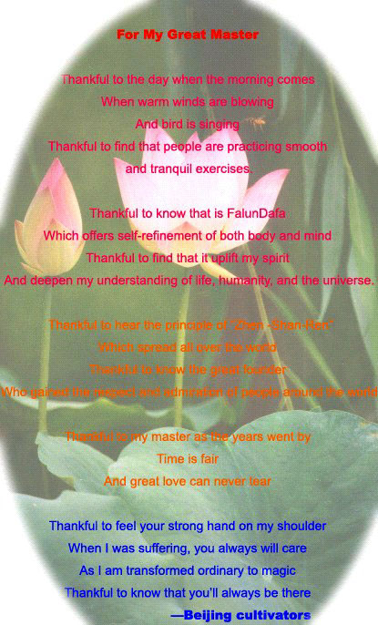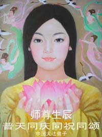 师尊,尽管弟子能感受到您在我身边,尽管弟子知道千言万语也无法表达弟子的感恩之情,可是,在今天,您华诞之日,弟子还是借助人类这乏力的语言向您倾诉,向您表白弟子对您的感激思念! 七年多来,弟子无时无刻不在思念您,当弟子迷茫时,有您的鞭策!“以法为师”,当弟子痛苦时,有您提醒“难忍能忍,难行能行”,当弟子懈怠时,有您督促“少息自省多精進”,当弟子精進时,有您鼓励“我们是走在神的路上”!多少次,梦中与您见面,慈眉善目的您,只是微笑而不语,而我却泪湿枕巾。我知道,那是弟子不精進的缘故。您的笑而不语,使我敢于直面匪警,心中充满了坦然与无畏,您的慈悲宽容,使我对阵共产邪灵,充满了智慧与法力,我面对歹徒毫不畏惧,我面对邪恶坦然出击,我面对名利的诱惑淡然视之!因为有您在,邪恶在我面前遁形,因为有您在,以前的孜孜以求的名利现在不求而自得!周围的朋友都说,我有福气! 可我知道,如果没有师尊您,如果我学法不精進,就没有弟子现在一切的一切! 祝师尊生日快乐! 合十! 全体北京大法弟子衷心的祝愿伟大的师尊生日快乐!