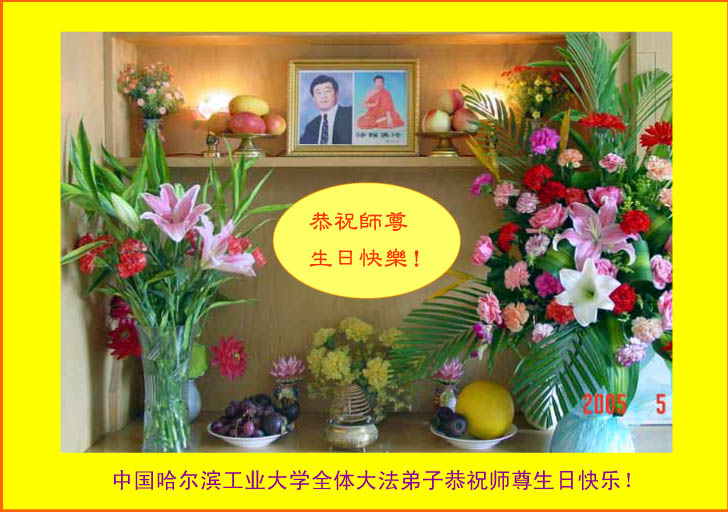 今天是世界法轮大法日,在这普天同庆的日子里,我们邓州市全体大法弟子恭贺慈悲伟大的师父生日快乐!恭贺法轮大法洪传十三周年!请师父放心,我们一定努力做好师父要求的三件事,正念正行,走好最后的路。 河南省邓州市全体大法弟子! 2005年5月13日 全体哈尔滨市南岗区大法弟子祝师尊生日快乐!