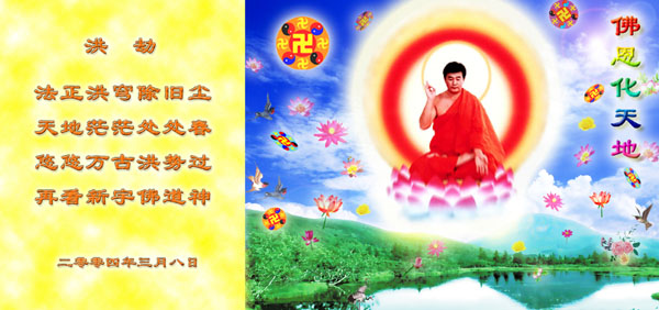 2005年5月13日 长春大法弟子、小弟子祝师尊诞辰快乐慈悲苦度一念慈悲下世来, 十恶毒世天门开, 浩瀚苍穹正法成, 佛恩浩荡救众生。 2005年5月12日 黑龙江省哈尔滨市平房区全体大法弟子恭祝师尊传法十三周年!