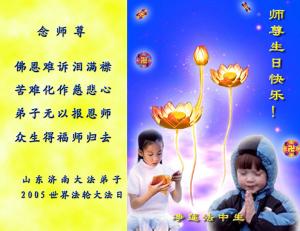 师父您好!师父您辛苦了! 重庆全体大法弟子恭祝伟大的师尊生日快乐!向师尊致以最崇高的敬意!感谢师父的慈悲苦度!请师父放心,我们一定要紧跟师父正法進程,形成金刚不破的整体,分秒必争尽力救渡更多世人! 给师尊敬礼双手合十! 重庆大法弟子敬上!同时代表被非法关押的所有同修向师尊问好! 2005年5月14日 我代表山东莱阳弟子向师父问好!祝师父生日快乐!