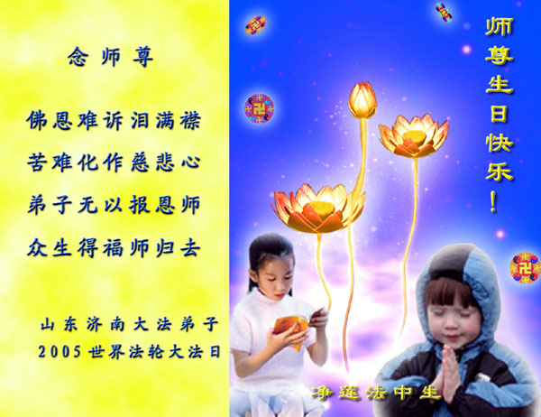 师父,四月初八,是您的阴历生日,日照大法弟子想念您!遥祝您生日快乐! 在师父五十四岁华诞暨世界法轮大法日来临之际,遥望纽约,我们满含热泪,倍加思念师父,我们在心里一遍遍的念着:师父,您辛苦了!感谢您的一路呵护!感谢您的慈悲苦度!师父,祝您生日快乐! 千言万语难以倾诉我们对师尊的无限敬仰与无尽思念!用尽世间最美的语言难以形容师尊的崇高、伟大与无量慈悲! 谢师尊,信任我们,恩赐我们“正法时期大法弟子”的殊荣! 谢师尊,把我们从地狱捞起,为我们承受深重的罪业,让我们脱出凡尘! 谢师尊,征途中一路关爱、操劳,护持我们冲破层层关隘险阻! 谢师尊,把洪大的慈悲与智慧赐予弟子,让我们在正法中不断舍去执著、抛却自我、救度众生!无以报师尊,无以谢洪恩,唯有更精進,圆容三件事。 日照全体大法弟子合十! 2005年5月14日 天津港北监狱正念正信大法弟子向师父问好!祝师父生日快乐!