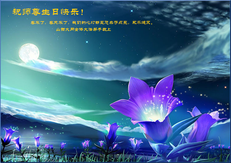 祝师尊生日快乐! 春来了,春天来了,我们的心灯都是您亲手点亮,永不熄灭。 山西大同全体大法弟子敬上 山东东营大法小弟子祝师父生日快乐