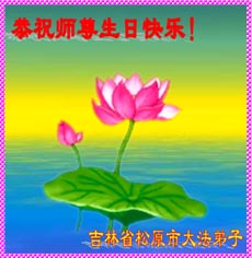 尊敬的师父您好:祝师父生日愉快! 我们深知迷在世间的生命,没有师父洪大慈悲的救度,怎能回去。我们无法用语言表达内心的感激,我们只有做好三件事,修好自己,以表达对师父的敬意和感谢。 黑龙江双鸭山大法弟子 2005年5月14日 辽宁省兴城市全体大法弟子恭祝师尊生日快乐