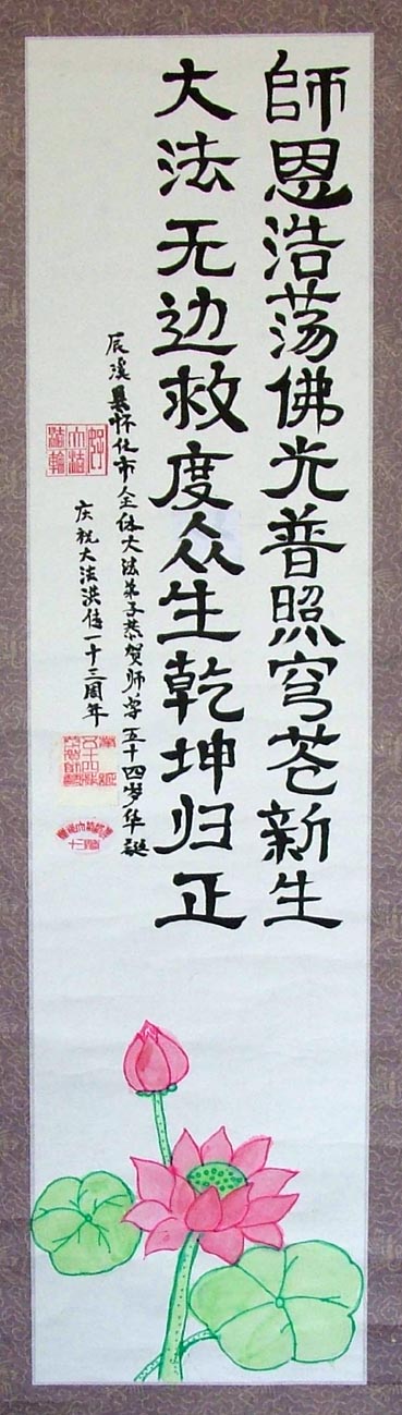 伟大的师尊您给了弟子全新的生命,修炼八年来弟子身体的受益、心灵的净化无不是来自师尊的教诲和给予,在此弟子谢谢师尊。祝师尊华诞快乐!以后弟子会更加严格要求自己,勇猛精進,做好三件事,不负师尊所望。 佳木斯一个学法家庭小组 对联:恭贺伟大师尊华诞及传法十三周年