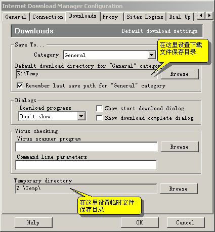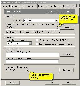 下载软件(IDM或者是ReGet)的文件保存目录也要设置到虚拟磁盘上,同时也应该可以把它们的临时文件目录也设置到虚拟磁盘上。 IDM下载目录的设置界面 |
