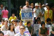 | 【明慧网2005年6月26日】(明慧记者徐菁报道)1999年7月,中国前国家主席江××曾叫嚣“要在三个月内消灭法轮功”。六年过去了,它做到了吗?在过去的六年里,江及追随其迫害法轮功的官员们已经被30多个国家和地区以反人类罪、酷刑罪和群体灭绝罪起诉。一年前的6月中旬,法轮功学员向北伊利诺州区法院对正在芝加哥访问的中国信息产业部部长、前河北省委书记王旭东递交了民事诉讼,起诉他在2000年6月至2002年11月担任河北省书记期间对法轮功学员犯有的酷刑罪。 2005年6月25日,上千名法轮功学员再次云集芝加哥,举行了以“揭露迫害,正义必胜”为主题的大型活动,展现他们不可泯灭的信念。 联邦广场前准备出发的游行队伍在芝加哥的地标联邦广场(Federal Plaza)的新闻发布会上,法轮功学员代表们分别从大法洪传、中共邪党迫害酷刑、全球诉江等多个方面向世人介绍了法轮功学员过去六年里所走过的风雨路。   新闻发布会现场 |