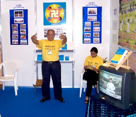 【明慧网2005年7月8日】巴拿马新闻报7月3日至16日的报导说,法轮功学员参加了近日在巴拿马举行的国际书展,智利总统和30名智利作家也参观了书展。图为法轮功的展位。