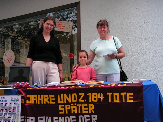 | 【明慧网2005年8月17日】德国海尔布隆(Hohenloher)报2005年7月30日报导,星期四下午在Oehringer Poststrasse街上出现了一个名叫“中国制造”的人权信息展位。路上行人来去匆匆,显得十分忙碌。这个世界危机四伏,每个人随时随地都可接收到各类的信息。有些人路过这里会停下来了解在中国的迫害和劳教所的情况,以及各国媒体与政府在此事件中的沉默。中国境内并不缺乏工作机会,然而许多人却被强制从事廉价的劳动,而西方投资人一直被蒙在鼓里。向人们讲述真象的女士们 1999年7月20日以后,一亿的中国人突然间被打成“头号敌人”。前中共领导人江××下令对法轮功学员采取“名誉上搞臭,经济上摧毁,肉体上消灭”的镇压手段,少数人像是着了魔似的抢着做摧毁中国社会的替罪羊。至今,曾在中国最受欢迎的气功功法──法轮功,仍受到镇压。 在靠近步行区的展位有三名来自Oehringen的女士向民众揭露上述真象和发送传单给路人。较年轻的女士向驻足的民众讲述着法轮功的真象。年纪最轻的小朋友则是在我们对面骑着木制长颈鹿,享受着Poststrasse街上的徐徐清风。
