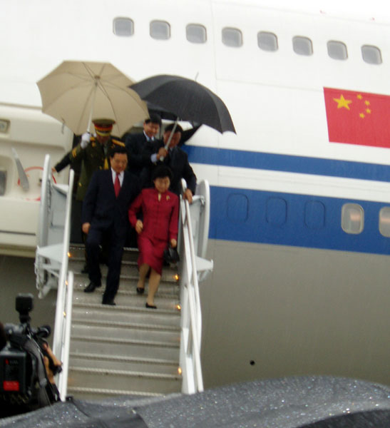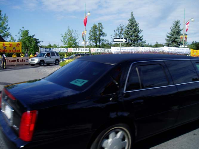 【明慧网2005年9月9日】(明慧记者英梓渥太华报道)2005年9月8日上午,胡锦涛率团在暴风雨中抵达加拿大首都渥太华。来自加拿大各大城市和美国部份城市的数百名法轮功学员在机场、胡所住的旅馆和总督办公室等地,打出“严惩江泽民、罗干、刘京、周永康”、“法办迫害法轮功的恶警和坏人”、“中共停止迫害法轮功”、“胡锦涛,神和人民留给你的时间不多了”等横幅。胡一行出访者中,不见加拿大皇家骑警监视名单中的中共官员薄熙来。  胡锦涛在暴雨中走下舷梯 |   胡锦涛的汽车经过法轮功学员请愿现场 |