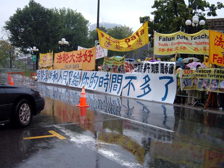 无论胡锦涛一行的车队离开机场、来到旅馆,还是抵达总督府,沿路都可以看到法轮功学员在风雨中打出的横幅:“严惩江泽民、罗干、刘京、周永康”、“法办迫害法轮功的恶警和坏人”、“胡锦涛,神和人民留给你的时间不多了”、“中共停止迫害法轮功”、“法轮大法好”、“真善忍”等横幅。 据了解,江泽民、罗干、刘京和周永康也被列入加拿大皇家骑警名单中,这个名单中包括直接参与迫害的各级中共党委、“610”负责人、政府官员和劳教所恶警和其他不法人员中共官员45名。根据加拿大“反人类和战争罪方案”,如果这些人试图進入加拿大,将会立即受到调查,结果可导致这些人被拒绝发放签证、并被禁止入境,甚至会因其犯下的“反人类罪”在加拿大遭到起诉。 法轮功学员王工石说,“现在,处于中共权力顶峰的胡锦涛面临着选择,如果他还选择违抗民心和天意,继续迫害,那么他面临的不但是耻辱,还有还不清的罪业,悲惨的未来。如果他能够抓住时机,停止迫害法轮功,同恶党决裂的话,他还有可能成为历史上的一个正面人物,然而时间不多了。”