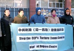 【明慧网2006年1月15日】近百名法轮功学员2006年1月14日聚集在驻多伦多中领馆前,抗议中共把其一直用来在精神上摧残法轮功学员的《同一首歌》拿到加拿大来演出。法轮功学员代表张照进指出:“歌声的背后,是迫害者血腥的暴力,是邪恶的屠杀伴奏曲。” 法轮功学员多伦多中领馆前抗议中共利用《同一首歌》迫害法轮功 |