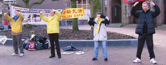 | 【明慧网2006年1月26日】阿芬•安•得•莱茵(Alphen aan de Rijn)是坐落在莱茵河畔的小镇。美丽的莱茵河从市中心穿过。2006年1月21日,荷兰法轮功学员来到这里展示功法,并向当地民众揭露中共对法轮功学员的残酷迫害。了解了迫害真相的人们纷纷签名,支持荷兰法轮功学员以群体灭绝罪起诉迫害元凶江××。学员展示功法 一位中年妇女领着一个少年走过来,他们想知道学员们在干什么。学员首先解释了什么是法轮功,然后向他们展示了法轮功学员被中共恶警残酷折磨的图片,告诉他们这样残忍的暴行每天在中国发生着。 学员也向她讲述了荷兰法轮功学员以群体灭绝罪起诉迫害元凶江××的行动,那位妇女表示愿意签名支持,并讲给少年,让他也签名。她说,“支持正义和帮助他人,这对他是很好的一堂课。” 一位住在当地的中年妇女询问哪里可以学炼法轮功。一位住的最近的学员和她安排了教功事宜。 有位先生实在是无法理解为什么中共要残酷迫害这么美好的功法,学员向他讲述了法轮功使人心向善,提倡和谐宽容,而中共政权是以暴力和谎言为统治基础,鼓吹斗争哲学。法轮功的日益普及和广受欢迎使中共感到不安和认为受到威胁,从而发动迫害。这位先生和学员做了长时间交谈。