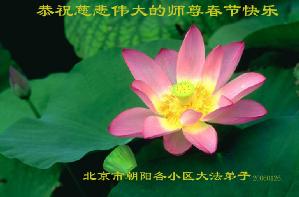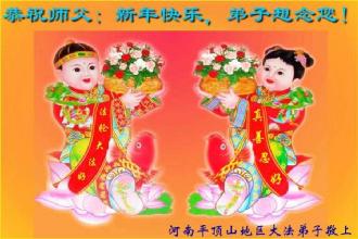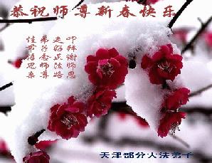师父:您好!新年快乐! 在新春佳节来临之际,我们河南平顶山地区全体大法弟子更加想念您。 回顾修炼走过的历程,弟子每一步都离不开师父的点悟、教化,师父传授于众生的高德大法,深深的吸引、感动、启发了全世界那么多的受益者。大法的神圣与威严,使我们每一位大法弟子切身感受到了师父洪大的慈悲,认识到了修炼的严肃性。 在目前正法形势不断快速推進的情况下,我们一定会用大法给予的智慧和力量,互相配合、整体协调,采用各种有效可行的方式向世人讲真相,救度更多的众生。用我们坚定的正念和辛勤的付出,脚踏实地的步入永远辉煌的未来。 师父,请您等我们的好消息。 合十 全体平顶山地区大法弟子。 2006年1月24日 天津大法弟子祝慈悲伟大的师尊农历新年愉快!