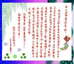 我的丈夫和我的女儿不修炼,可他们都非常支持我,一有时间就帮我做真相,并都已三:退.。在农历新年来临之际,我们全家向师父问好!祝师父农历新年快乐!谢谢师父! 辽宁省黑山县大法弟子及其家人 2006年1月24日 辽宁省黑山县太和大法弟子祝尊敬、伟大、慈悲的师父农历新年好!