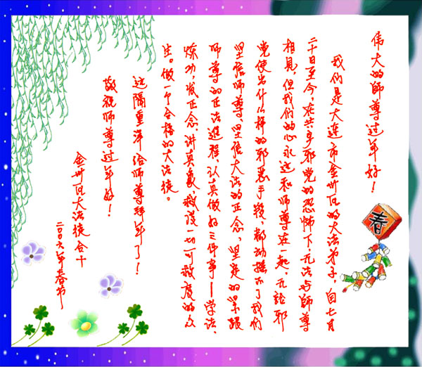 师父,过年好!我是您的小弟子,我也“助师世间行”,我给幼儿园的小朋友讲真相,我做到“打不还手,骂不还口,有一次,小朋友推我,我也没还手;请师父放心,我会做得更好。 您的小弟子敬上 2006年元月28日 山东潍坊大法弟子恭祝师尊过年好!