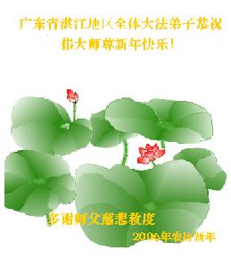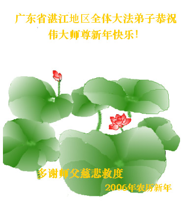 祝师父新年愉快! 每逢佳节倍思亲,在这万家团圆的新春到来之际,千言万语汇成一句话:师父我们想您!我们渴望早日和您团圆。请师父放心,在新的一年里我们一定认真做好三件事,争取早日完我们的史前洪愿! 2006年1月24日 广东省麻章区全体大法弟子祝伟大师尊新年好