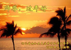 尊敬的师父: 在这新年佳节之际,天津宝坻区全体大法弟子祝您新年快乐。并向您保证,我们在神的路上一定做好三件事。 二00六年一月二十五日 山东聊城大法弟子祝师父新年好!
