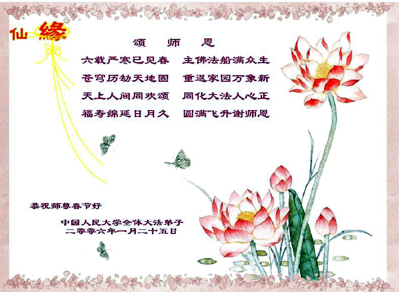 值此新春佳节之际,中国人民大学全体大法弟子一定不负师恩的慈悲呵护,在最后的路上越走越精進,做一名合格的大法徒。 颂师恩 六载严寒已见春 主佛法船满众生 苍穹历劫天地固 重返家园万象新 天上人间同欢颂 同化大法人心正 福寿绵延日月久 圆满飞升谢师恩 中国人民大学全体大法弟子。 二零零六年一月二十五日 山东省兖州市全体大法弟子及弟子全家恭贺师尊新年快乐!