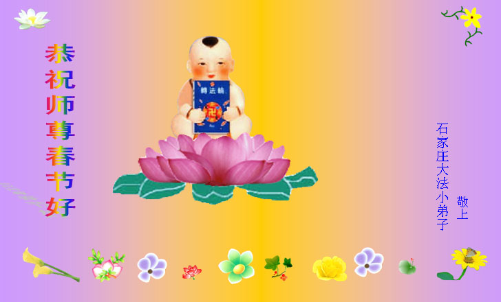日复一日,年复一年,时间飞快的流逝,我却没做到更好,在此向师父保证:在新的一年来临之际,我会带着师父的教诲与苦心做好大法弟子应该做的三件事,不辜负师父的厚望,早日与师父和同修一起圆满回家。 唐海县小大法弟子:季净 在此新春佳节之际,小大法弟子特此向师尊拜年!祝师尊新年好! 弟子在新的一年里,会做好大法弟子该做的三件事,跟上正法路,随师尊一同回家,从新真真正正的做一位合格的大法徒,请师尊放心,弟子一定会做的越来越好。 唐海县小大法弟子:同心 2006年1月18日 伟大慈悲的师尊新年好! 师父您说我们是浊世的金光、世人的希望、助师的法徒、未来的法王。所以我们要在未来的辉煌日子里,勇猛精進,做好师父要我们做的三件事,在不远的明天,同师父一起圆满的回家。 唐海县小大法弟子:纯洁 2006年1月17日 伟大慈悲的师尊:新年好! 请师父放心,我一定要精進,做好师父教给的三件事,也不愧慈悲的师尊对我的苦度。 唐海县小大法弟子:小莲 2006年1月18日 唐海县大法弟子祝福师尊新年好!