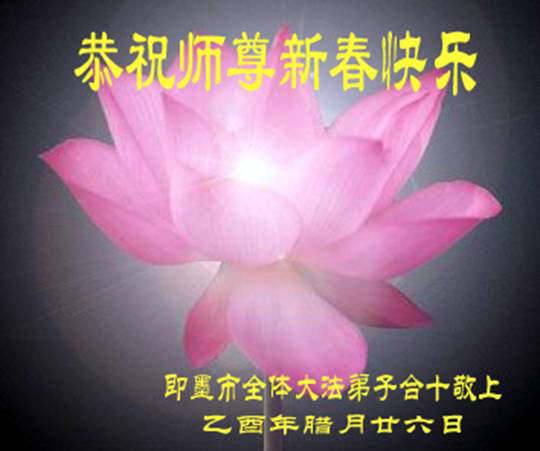新春佳节到了,我们全体大法弟子向尊敬的师父致以最真诚的祝福,衷心祝愿师父新年愉快,在这里向师父拜年了! 我们一定以法为师,跟上正法進程,在三件事中做的更好,更圆容,形成一个圆容的整体。 山东德州全体大法弟子及得救众生向慈悲的师尊致以新年的敬礼,恭祝师尊新春快乐!