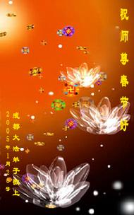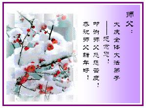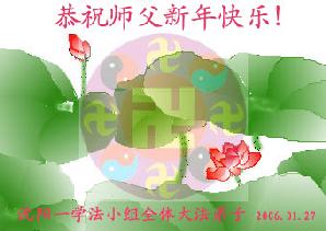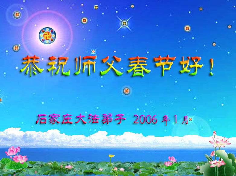 师尊新年好,大法弟子给您拜年,恭祝师尊新年快乐。 海南省全体大法弟子合十2006年1月27日 沈阳市一学法小组全体大法弟子恭祝师父农历新年快乐!