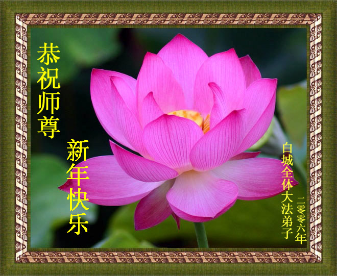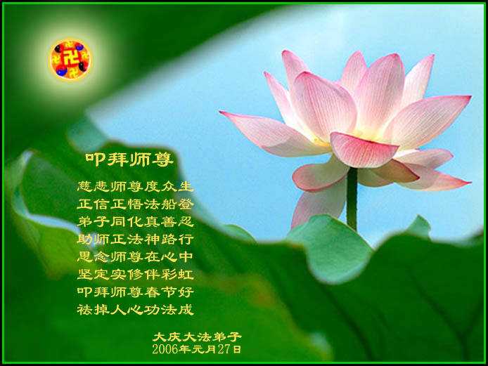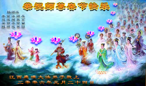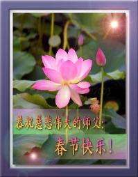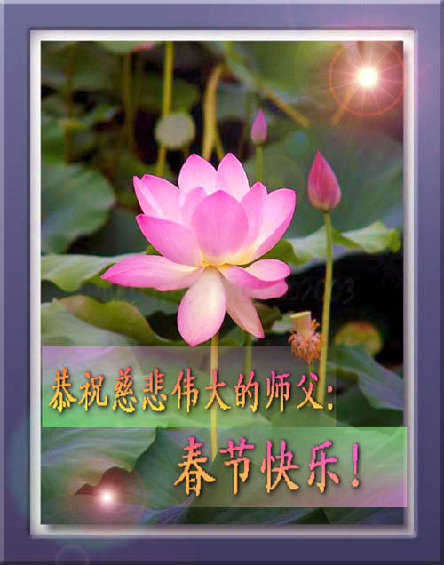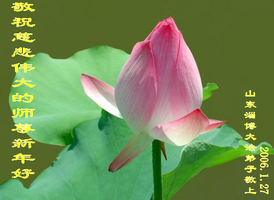 每逢佳节倍思亲,弟子们想念您!纵有千言万语,也难以表达此时我们对师父的感激。在这新春佳节即将到来之际,弟子们怀着崇敬的心情,给师父拜年!衷心的祝愿:慈悲伟大的师父农历新年好! 沈阳市一学法小组全体大法弟子敬上 2006年1月27日 山东莱芜市大法弟子恭祝师尊新年好!