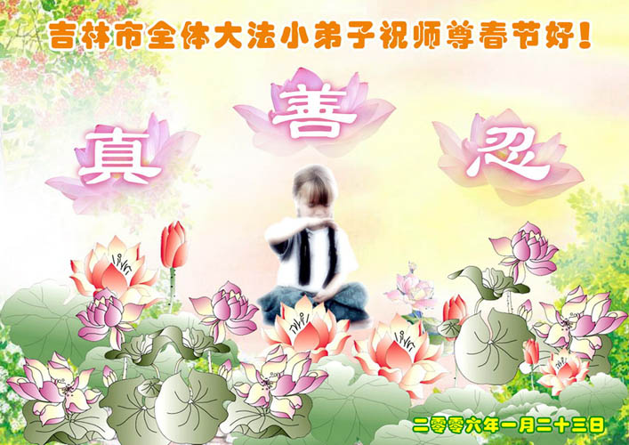 师父啊,小弟们想念您!给师尊拜年! 每一次过节的时候,我们都希望通过明慧网给您带去小弟们的真心问候。可是有的时候我们也觉得自己很惭愧,因为有时我们并没有完全兑现自己在贺词中写的那样,今天我们把自己的真实情况写出来,就是要能够面对自己的不足,把学法、炼功落到实处,真正做好师父交给我们的三件事。我们作为小弟子也要越最后越精進呢! 吉林市全体大法小弟子叩拜 2006年1月23日 上海法轮大法弟子敬祝师尊新年快乐!