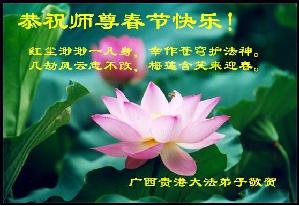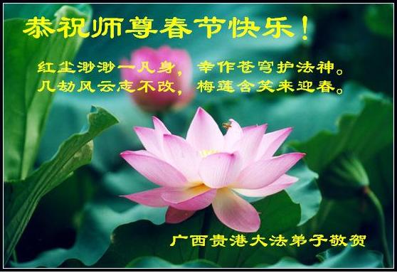 大陆真相项目组(广东地区)向慈悲伟大的师尊恭贺新年好!在新的一年里,我们一定不负师尊厚望,做好三件事,紧跟师尊,以法为师,只要我们能在法上认识法,我们就一定无所不能。 广西全体大法弟子向师尊问好!恭祝师尊新春快乐!