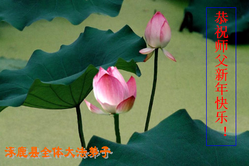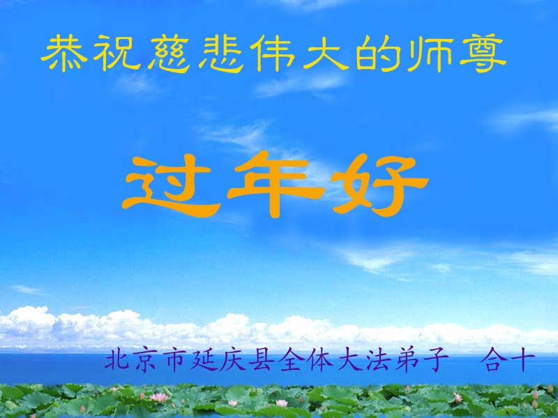 敬爱的师尊: 祝您农历新年快乐! 河北省灵寿县全体大法弟子给师尊拜年! 我们一定做好三件事,不使师尊失望!不使宇宙众生失望! 河北省灵寿县全体大法弟子叩上 大连大法弟子恭祝慈悲伟大的师尊新年好!