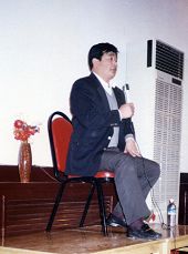 从来没有在凌晨五时炼功的我,第一次参加北京学员的晨炼。当时,天气有点冷。 交流会前,有安排海外学员代表,谈当地法轮功的情况。当时,自己不知道,怎样谈新加坡的情况。从以上所写,我很清楚,自己和北京学员,在修炼路上有很大的差距。也看到自己的不足。 二、 师父讲法 法会要结束前,大陆学员与海外学员,安排在北京某公园餐馆吃晚餐。当大家正在吃晚餐时,餐馆门这时开了,师父走進餐馆。学员见到师父时,在场学员,没有口号、没有命令,全体起立,以最最热烈的掌声,欢迎慈悲、伟大的师尊。这一幕,如今历历在目。 师父刚开始讲法时,是站着。由于坐在后面的学员,不能很清楚看到师尊。师尊为了让坐在后面的学员,能很清楚看到师父。师父就必须站高,这时工作人员,拿了一张桌子,在桌子上放一张椅子。师父就坐上这张椅子讲法。坐在后面的学员,这时能很清楚看到师父。   师尊为了让后面的学员能看的见,而高坐在桌子上讲法 |