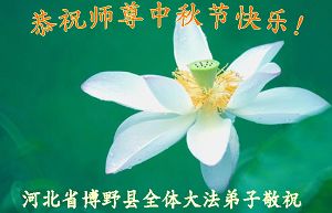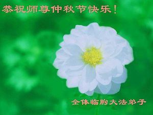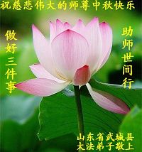 尊敬的师父您好! 中秋节到了, 我们拜见师父! 借此送去我们最崇高的敬意和深深的祝福: 师父中秋节好! 我们无以回报浩荡师恩, 无论如何, 只有精進、精進! 听师父的话, 不忘使命, 做好正法时期大法弟子应该做好的一切, 抓紧救度被恶党迷惑了的众生。 让师父多一些安慰, 祝愿师父所成就的一切一帆风顺!! 合十礼 内蒙古通辽市全体大法弟子 山东省东营市及胜利油田的全体大法弟子恭祝慈悲伟大的师尊中秋快乐!