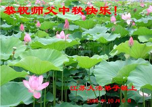 师父好!祝师父节日快乐!弟子一定会跟上正法進程,站在正法角度圆容师父所要的一切,修好自己,走好每一步。请师父放心! 秦皇岛大法弟子 二零零六年十月二日 安徽省滁州市全体大法弟子祝伟大的师尊中秋快乐
