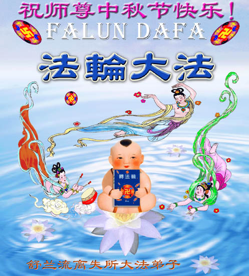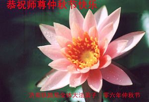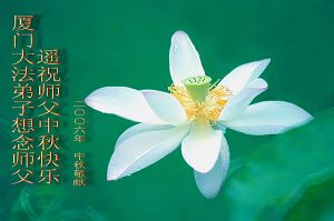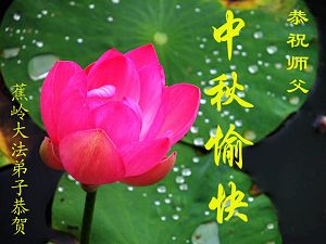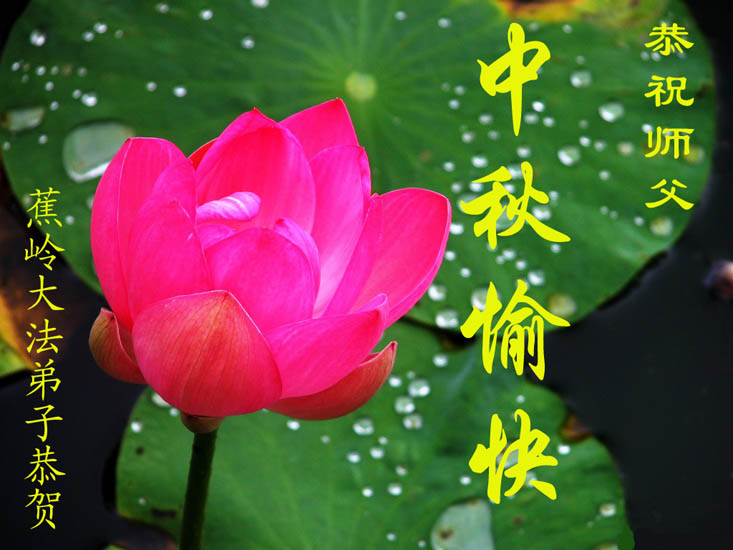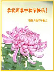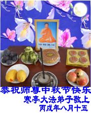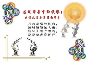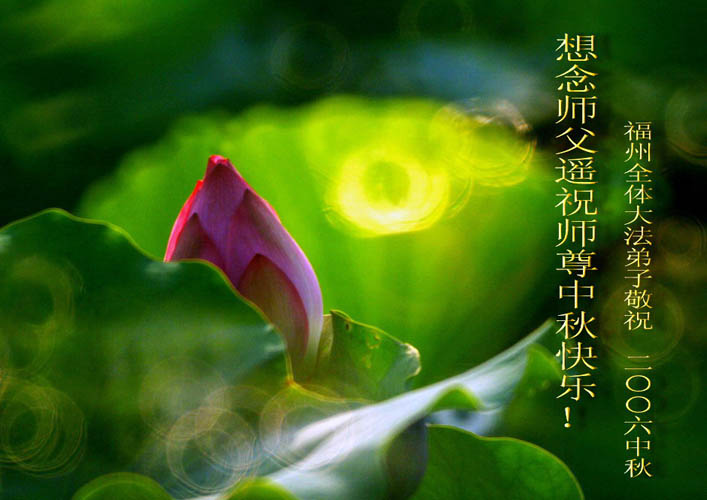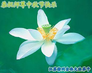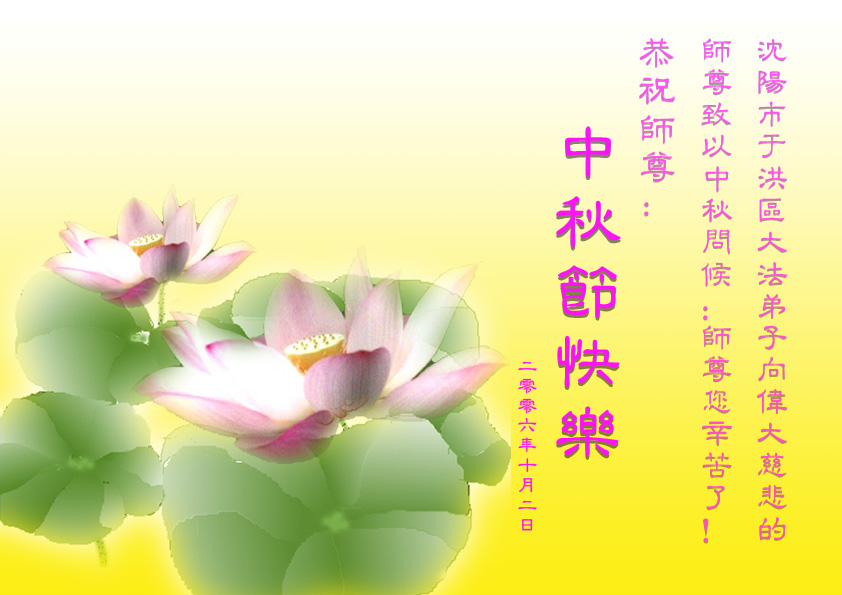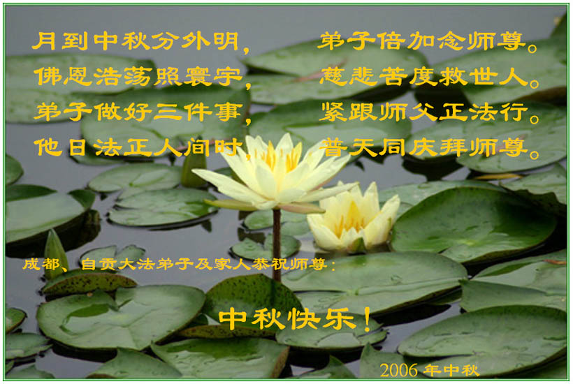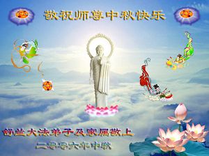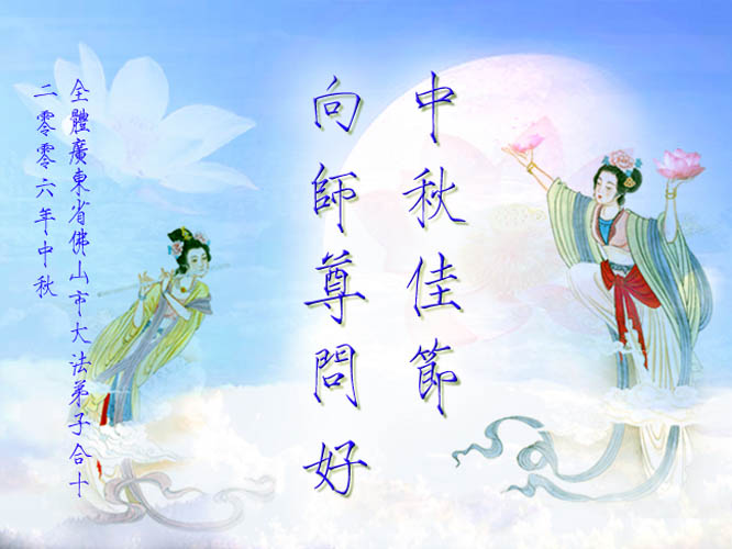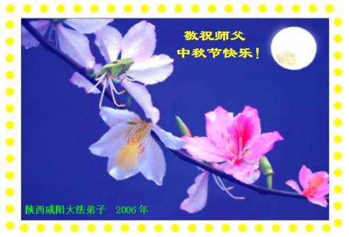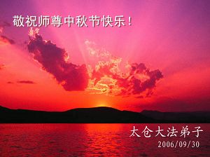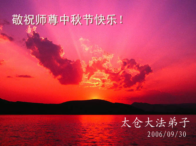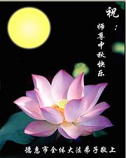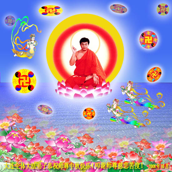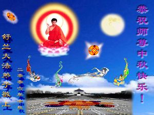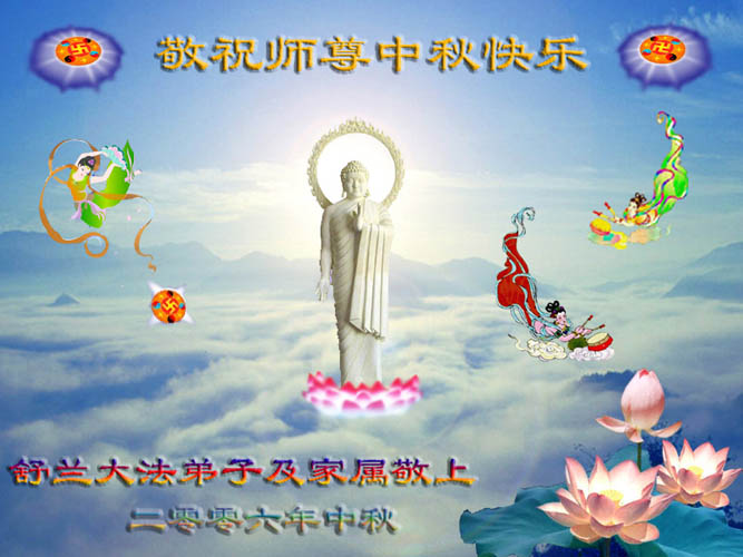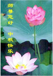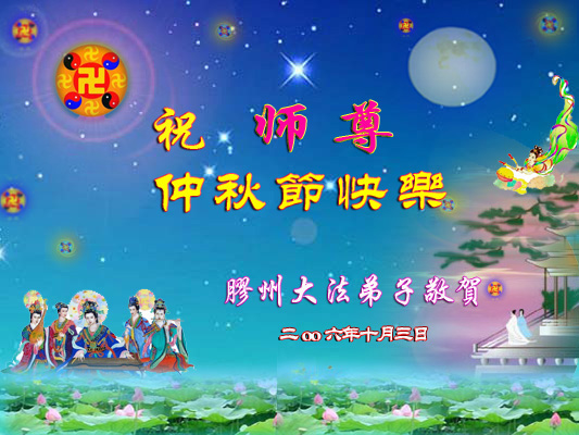 中秋问候 每逢佳节倍思亲 万里之遥若亲临 时刻沐浴佛恩中 美妙神胜荡浊清 弟子惟有更精進 救度更多迷中生 邪恶尽除普天庆 恭迎师尊返故里 2006年10月2日 青岛大法弟子祝师尊中秋节快乐