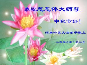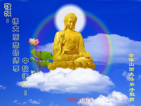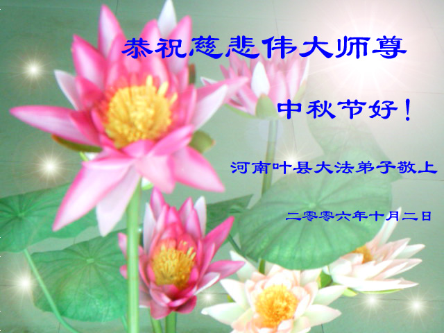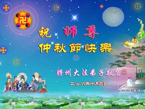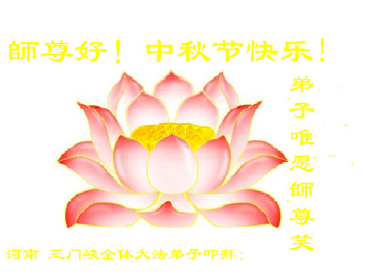 弟子叩拜:师尊好!弟子代表:三门峡全体大法弟子与学员及世人向师尊叩拜;敬祝师尊中秋节快乐!弟子唯愿师尊笑! 二零零六年十月二日(丙戌年八月十一日) 临朐大法弟子恭祝师尊中秋节快乐