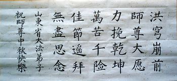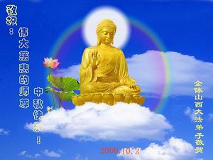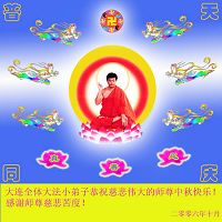至此中秋佳节之际,我们五常市全体大法弟子恭祝慈悲伟大的师尊中秋节快乐。在这佛恩浩荡的正法时期,我们五常大法弟子在师尊的慈悲呵护下,平安顺利的走过了两年多。感谢师尊在困难时期给我们指点迷津,在顺利时期鼓励我们,在此我们全体五常大法弟子请师尊放心,我们不辜负师尊的慈悲苦度,一定整体配合好,做好师尊要求的三件事,走好最后的每一步。合十! 2006年10月2日 郸城县全体大法弟子恭贺师尊中秋节快乐!